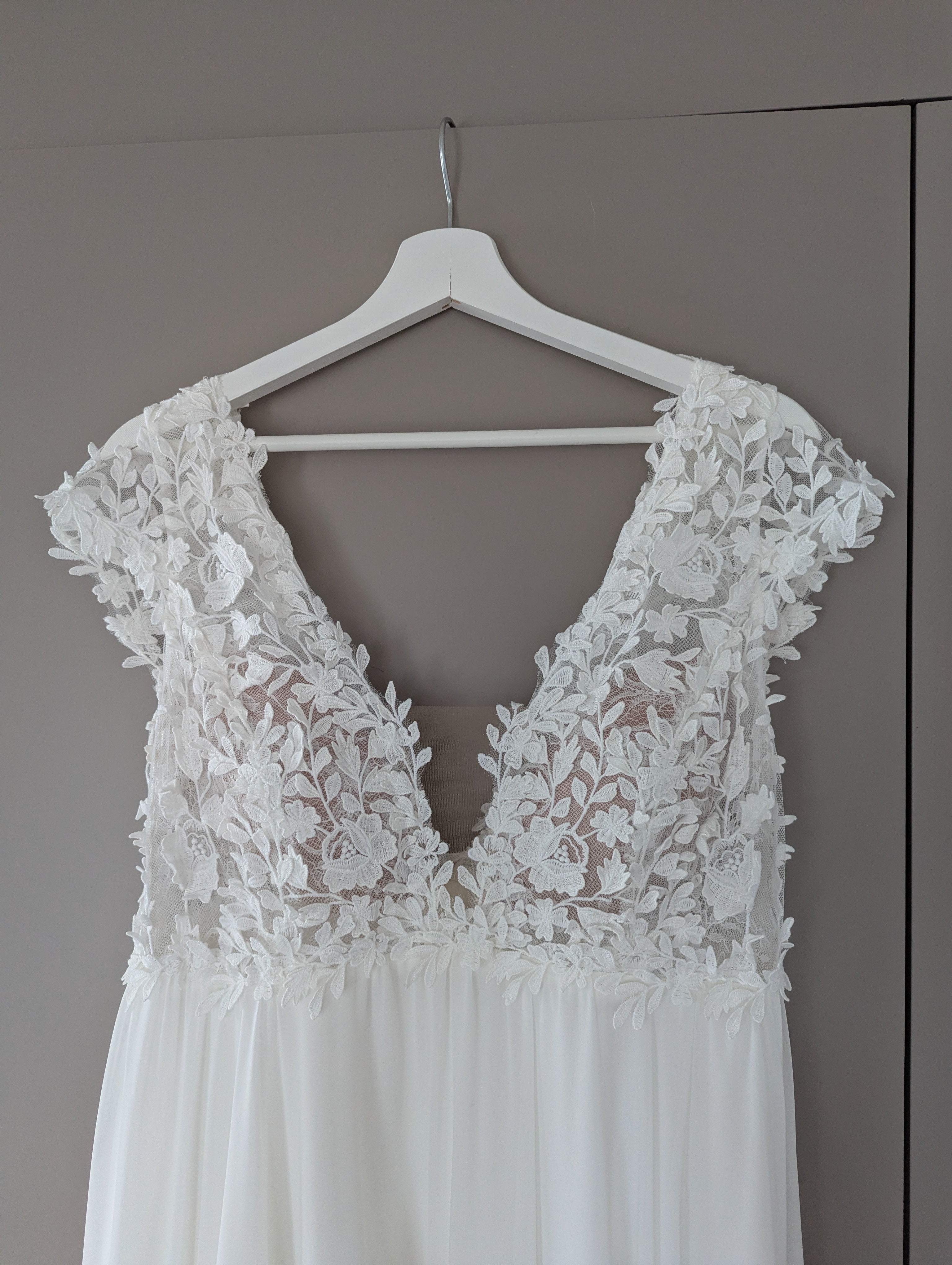 Luftig leichtes und super bequemes Kleid mit Blüten-Oberteil und schönem Dekolleté sowie Rückenausschnitt. Die bereits eingenähten BH-Cups sorgen für einen sicheren Halt. Es wurden leichte Anpassungen bei der Brustpartie und der Länge gemacht. Die Schleppe wurde abgenommen. Für mich war es das ideale Kleid - denn mein Babybauch (6. Mnt.) hatte gut Platz und ich durfte mich rundum wohl fühlen.