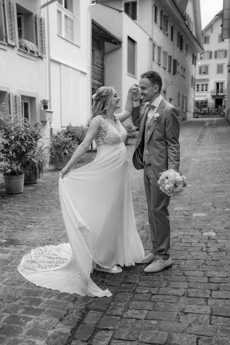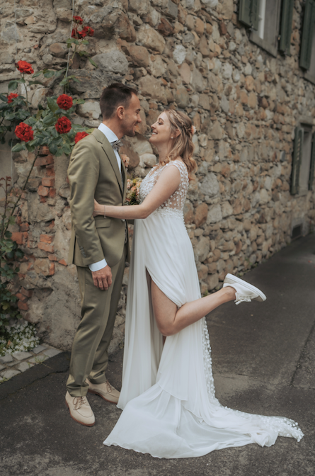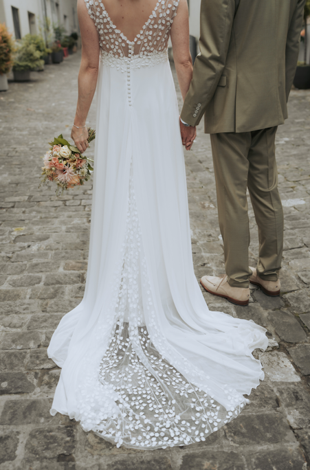 Ein modernes, romantisches Brautkleid ideal für Schwangere. Das Oberteil ist ärmellos und hat V-Ausschnitt. Der leicht fallende Rock hat einen seitlichen Schlitz und eine zarte Schleppe mit 3D-Applikationen. Das Kleid wirkt verspielt und elegant, und wurde stilvoll mit Sneakers kombiniert.
